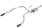 Does NOT fit Ram Classic. Includes the Rebel and models with G/T package. Fits through the factory bumper cut-outs (bumper has notches on the bottom). This 3" diameter into dual 2.5" Cat-Back™ system features the aggressive ATAK® sound with no drone inside the vehicle and exits through single 5" round black chrome on T-304 stainless steel tips on each tail pipe. Using BORLA® Stainless Steel Polish p# 21461 is NOT recommended with these black chrome tips. We suggest cleaning the tips with hot water and a microfiber cloth. A system with bright chrome on T-304 stainless steel tips is also available. Optional resonator 60667 can be added to the system to dampen the sound level. BORLA® Cat-Back™ and Axle-Back exhaust systems feature patented straight-through and multi-core technology designed to unleash hidden horsepower. Increased exhaust velocity adds power, driving excitement, fuel economy, and the distinctive BORLA® Sound of Power respected by motoring enthusiasts everywhere. Each system is built from premium, high-quality T-304 austenitic stainless steel, superior to T-400 series knockoffs (such as 409), to give you the absolute best in performance and durability. Ultra-smooth mandrel bends ensure maximum flow & power, and precision computer numerical control (CNC) manufacturing ensures an accurate fit. Optional resonator 60667 can be added to the system to dampen the sound level. Best of all, BORLA® stands behind every system with a Million-Mile Warranty. Just what you'd expect from the world's most experienced (and most winning) exhaust brand.